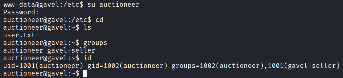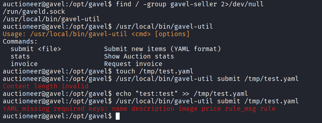 User auctioneer is member of the custom group “gavel-seller”. Using find to search for files owned by that group, I found the executable gavel-utils.