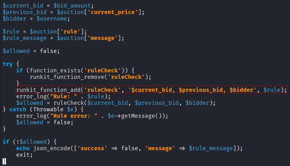 When a user makes a bid, a request is sent to includes/bid_handler.php. The file checks if the bid is generally valid first (enough money, the new bid is bigger than the actual one, etc), then, it checks the bid against a custom rule, created by the auctioneer user for the single auctions.