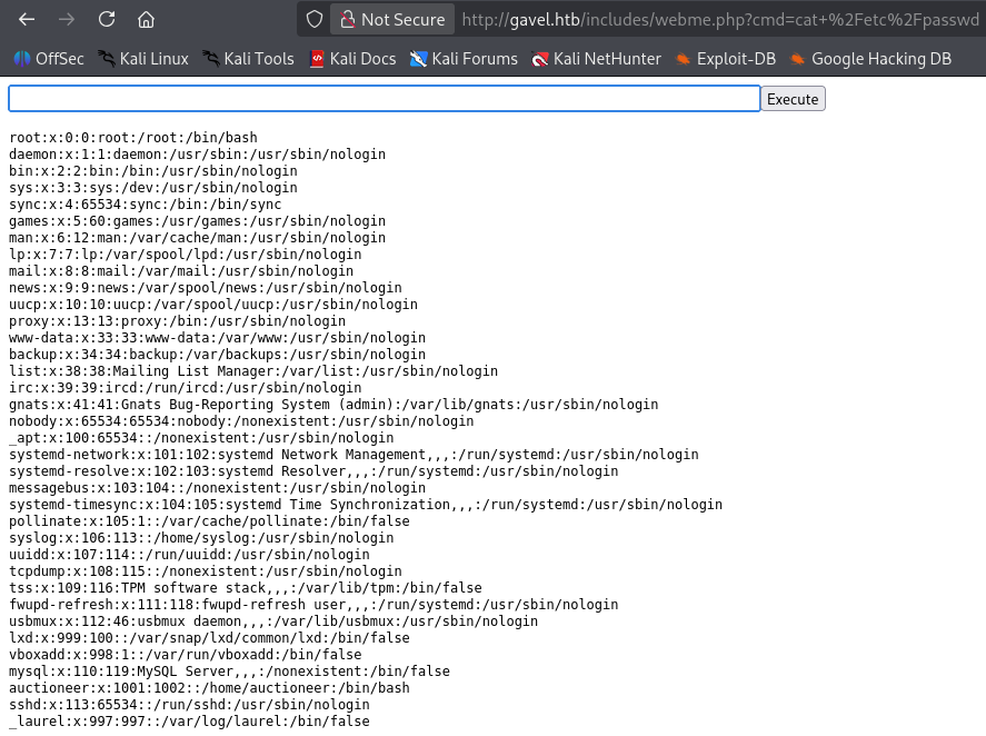 The user auctioneer’s password is the same dumped from the database (it doesn’t work from SSH).